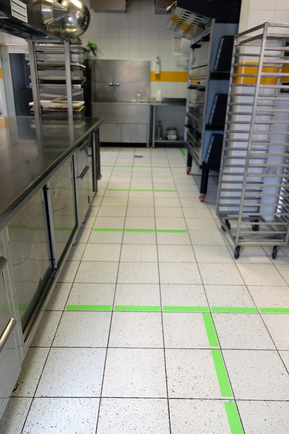 Per terra ci sono gli scotch di colore bianco e rosso per definire il distanziamento.