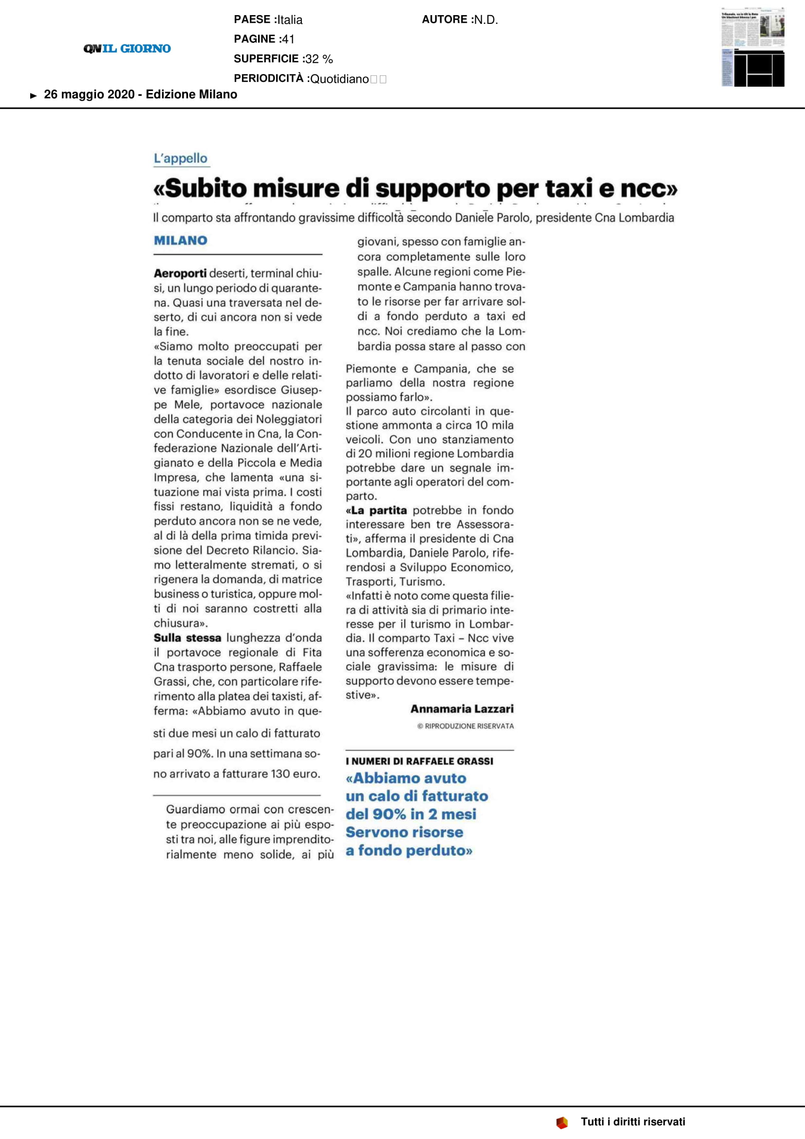 - il Giorno.it – 26.05.2020: “Subito misure di supporto per taxi e ncc”